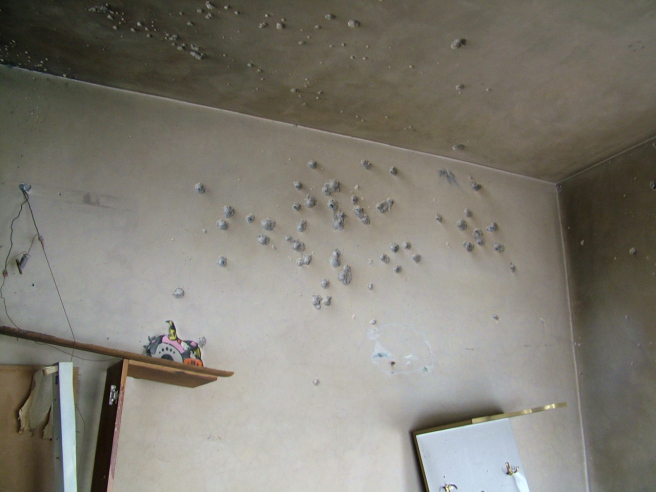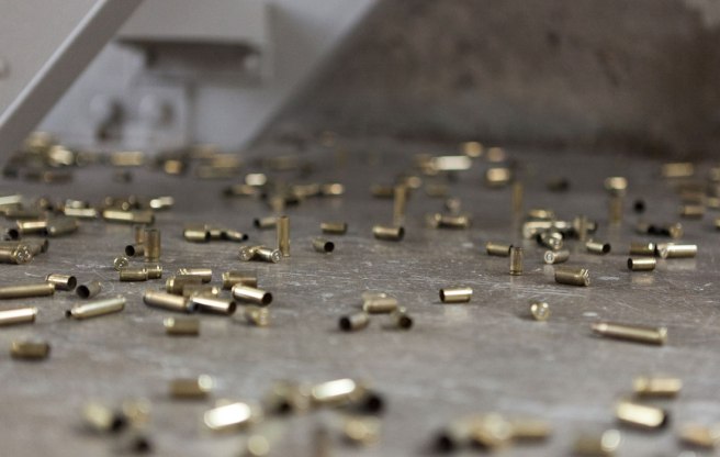 El suelo de la casa parecía una piscina de casquillos, se podía caminar entre ellos sintiendo el exceso de azófar debajo de los pies. Las paredes terminaron destruidas, renovadas para que parezcan una zona de guerra. El olor a pólvora tenía una presencia propia que ocupaba un espacio en la casa, como lo haría un mueble o ser humano. La tensión que había en la atmósfera era tan visible y palpable como los gabinetes de la sala, que ahora estaban llenos de boquetes.
